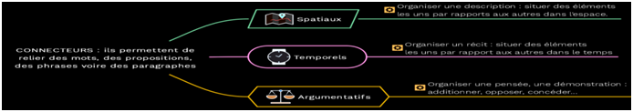 Les connecteurs sont des mots qui marquent un rapport de sens entre des propositions ou entre les phrases d'un texte. Ils jouent un rôle clef dans l'organisation du texte : ils en soulignent les articulations. Ils marquent les relations établies entre les idées par celui qui parle.