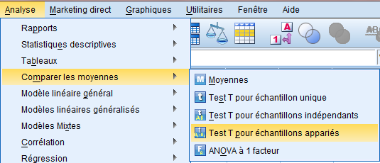 1. ننقر لائحة التحليل « Analyse » ، والتي تحتوي على مجموعة من القوائم الفرعية، 2. نحدد القائمة الفرعية مقارنة المتوسطات « Rubrique comparer les moyennes » التي تنسدل منها قائمة تضم مجموعة من الأوامر الفرعية