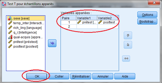 4. نقوم بنقل المتغيرين من حيز المتغيرات إلى الحيز المقابل « Variables appariées » وذلك عبر النقر المنفرد على المتغير الأول « prétest » لتأشير ثم النقر على السهم لنقله إلى مكانه في الحيز المقابل « Variable1 » ، ثم القيام ينفس العملية مع المتغير الثاني « postest » لنقله إلى « Variable2 » و هكذا نكون قد أعددنا ما يعرف بزوج التحليل المرتبط « Paire1 » الخاصة بهذا الاختبار. |