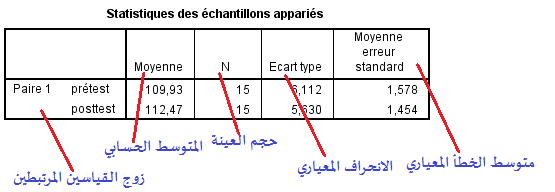 و يبين الجدول أن حجم العينة في كلا القياسين هو « 15 » و متوسط نتائج القياس الأول « prétest » هو « 109.93 » بانحراف معياري « 6.11 » و متوسط خطأ معياري يقدر ب « 1.57 » ، بينما متوسط نتائج القياس الثاني « postest » هو « 112.27 » بانحراف معياري يساوي « 5.63» ومتوسط خطا معياري يقدر ب « 1.45 » |