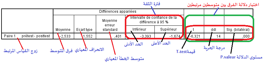 و لفحص الفرض الصفري، يمكننا بناء على بيانات الجدول اتباع إحدى الطريقتين: . الأولى حيث نعتمد على فترة الثقة للفرق بين المتوسطي المرتبطين « Intervalle de confiance de la différence à % 95 » ، والمكونة من حدين؛ الحد الأدنى « Inférieur » و الحد الأعلى « Supérieur » و من خلال الجدول يتبين لنا أن فترة الثقة لفرق المتوسطين محصورة بين حدين أدنى و أعلى [-3.39,-1.67 ] و بما أن قيمة الصفر غير محتملة الوجود بين حدي فترة الثقة فإننا نرفض الفرض الصفري H0 ونقبل الفرض البديل H1 ، وعليه نقر بأن هناك فرق جوهري بين متوسطي القياس البعدي والقبلي. . الثانية حيث نعتمد على قيمة مستوى الدلالة « Sig-bilatéral» والمعروفة ب « Pvaleur » ، والتي تقدر ب (0.001) وهي قيمة أقل من (α 0.05)، وفي هذه الحالة نرفض الفرض الصفري H0 ونقبل الفرض البديل H1 ، وعليه نقر بأن هناك فرق جوهري بين متوسطي القياس البعدي والقبلي.