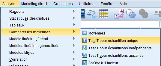 3. ضمن هذه القائمة الفرعية ننقر على الأمر المتعلق بمقارنة عينتين مستقلتين « Test.T pour échantillon unique» ، حيث تبرز لنا علبة الحوار والتي تحمل عنوان هذا الأمر. |