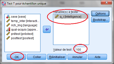 4. نقوم بنقل المتغير المعني بعملية التحليل وليكن في هذه الحالة متغير معامل الذكاء « q_i » إلى الحيز المعنون ب « Variables à tester » باستخدام السهم الذي يتوسط حيز المتغيرات و حيز التحليل. 5. نقوم بكتابة قيمة المتوسط المراد اختبارها و هي متوسط درجات افرد العينة في متغير الذكاء في المربع الخاص « Valeur de test » و هي في هذه الحالة « 100 »