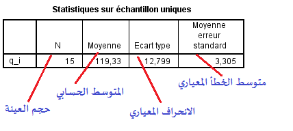 تعرض نتائج التحليل الاحصائي الخاصة بهذا الاختبار في على مستوى شاشة عارض النتائج « Sortie » في القسم الأيمن الخاص بنتائج التحليل الإحصائي و يتضمن جدولين هما: الجدول الأول: يحمل عنوان « Statistiques sur échantillon unique » و هو جدول يلخص الإحصاءات الوصفية المرتبطة بالعينة من حيث الحجم و المتوسط الحسابي لدرجات الأفراد في المتغير المعني بعملية التحليل و الانحراف المعياري، أيضا متوسط الخطأ المعياري و التي تعتبر معلمات ضرورية في تنفيذ الاختبار. |
