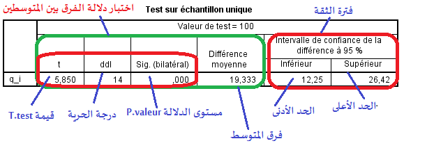 و يمكن تقسيمه إلى قسمين: القسم الأول يخص اختبار دلالة الفرق بين المتوسطين و يتضمن بيانات عن قيمة «T.test » تساوي 5.85 و درجة الحرية « ddl » تقدرب 14 و قيمة مستوى الدلالة « Sig-bilatéral » والمعروفة ب «Pvaleur » المقدرة ب 0.001 بالإضافة إلى فرق المتوسطين « Différence moyenne » و المقدر ب 19.33 القسم الثاني مخصص لفترة الثقة لاختبار فرق المتوسطين ويتضمن قيم الحد الأدنى « Inférieur » و الحد الأعلى « Supérieur » لفترة الثقة عند مستوى % 95 « Intervalle de confiance de la différence à % 95 » وذلك في المجال (26.42, 12.25)