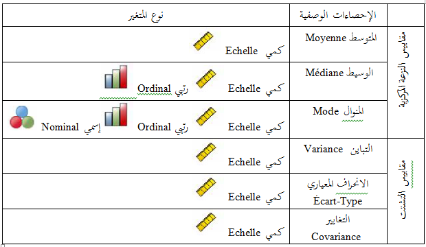جدول تصنيف الاحصاء الوصفي حسب نوعية المتغيرات: