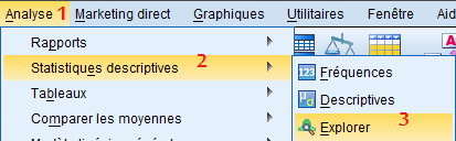 نحدد القائمة الفرعية الاحصاء الوصفي « Rubrique statistiques descriptives » التي تنسدل منها قائمة تضم مجموعة من الأوامر الفرعية