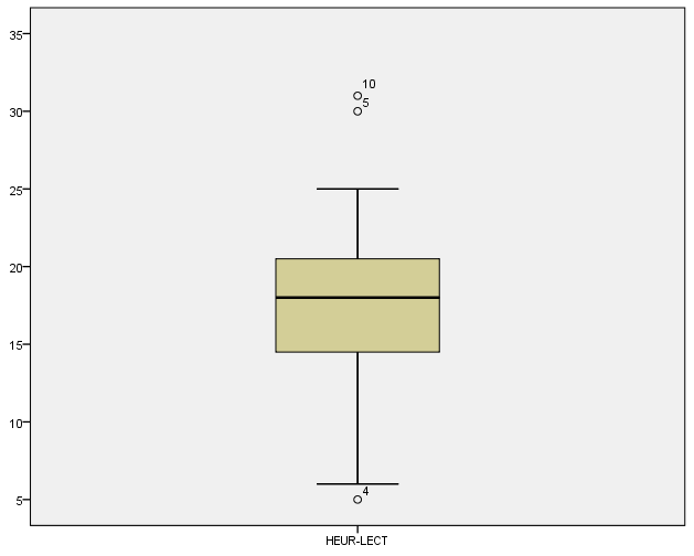 و يعطي صورة واضحة لتوزيع بيانات المتغير، وهو عبارة عن تقسيم لمستويات المتغير بالاعتماد على الربيعيات بالإضافة إلى قيمة الوسيط ضمن الربيع الثاني، و يضح من خلال الشكل أن التوزيع تقريبا متناسق ويقترب من الاعتدالية، لأن الوسيط يقترب من وسط الربيع الثاني مما يدل أن التوزيع ملتوي التواء بسيط، و يظهر الشكل أيضا القيم المتطرفة والتي تؤثر على اعتدالية توزيع البيانات، و هذه القيم على التوالي هي للأفراد (4،5،10)
