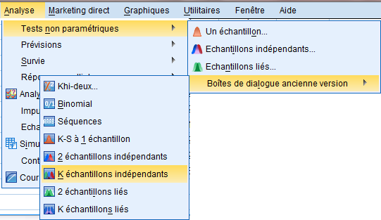 1. ننقر على لائحة التحليل « Analyse »، و التي تحتوي على مجموعة من القوائم الفرعية 2. نحدد القائمة الفرعية مقارنة المتوسطات « Tests non paramétriques » التي تنسدل منها قائمة تضم مجموعة من الأوامر الفرعية، فنختار القائمة الفرعية « boites de dialogues Ancienne version » 3. ضمن هذه القائمة الفرعية ننقر على الأمر المتعلق بمقارنة أكثر من عينتين مستقلتين « K échantillons indépendants» ، حيث تبرز لنا علبة الحوار والتي تحمل عنوان هذا الأمر |