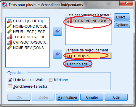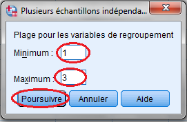 6. على مستوى هذه العلبة نقوم بإدخال الرموز التي تصف مدى المتغير المستقل و التي تم تحديدها عند ضبط خاصية « Valeurs » في تعريف المتغير المستقل « Attitlmd» في محرر البيانات، حيث سندخل الرقم « 1 » في الحيز « Minimum » والرقم « 3 » في الحيز « Maximum » باعتبار أن المتغير المستقل تصنينفي ينقسم إلى ثلاثة مستويات، ثم ننقر على المربع « Poursuivre » لتثبيت هذه المعطيات و العودة إلى علبة الحوار الرئيسية السابقة « Tests pour plusieurs échantillons indépendants» ، على مستوى « Type de test » نبقى على الاختيار المؤشر « H de Kruskal-Wallis » بالعلامة « ✔ » |