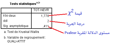 الجدول الثاني: والذي يحمل العنوان « tests statistiques » و المنجزة بناء على تقسيم المتغير المستقل « Quali-Attit» و الذي يتضمن بيانات عن تقدير الفرق بين متوسط رتب عينة الأفراد ذوي اتجاه ايجابي « Pos » و عينة الأفراد ذوي الموقف المحايد « Neut » و عينة الأفراد ذوي الاتجاه السلبي « Neg » في مقياس العصابية. حيث تظهر قيمة اختبار (Khi- deux » (χ2» تقدر ب:(1.77) و مستوى الدلالة المقربة«Sig. asymptotique» والمقدرة ب: (0.41)، و هذه المعالجة توجهها صياغة الفرضين البديل H1 و الصفري H0 على النحو التالي: