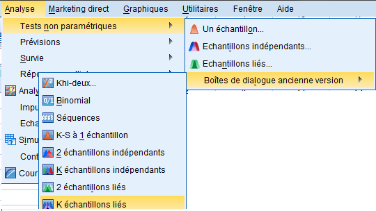 1. ننقر على لائحة التحليل « Analyse »، و التي تحتوي على مجموعة من القوائم الفرعية 3. نحدد القائمة الفرعية مقارنة المتوسطات « Tests non paramétriques » التي تنسدل منها قائمة تضم مجموعة من الأوامر الفرعية، فنختار القائمة الفرعية « boites de dialogues Ancienne version » 3. ضمن هذه القائمة الفرعية ننقر على الأمر المتعلق بمقارنة أكثر من عينتين مرتبطتين « K échantillons liés» ، حيث تبرز لنا علبة الحوار والتي تحمل عنوان هذا الأمر |