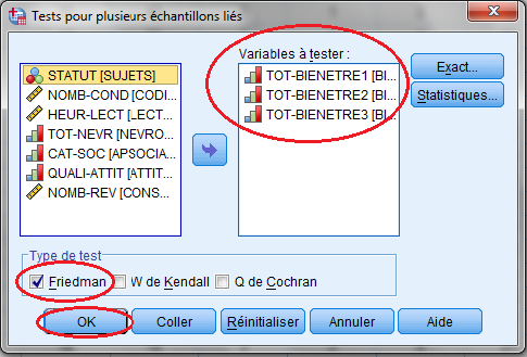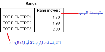 | 4. نقوم بنقل المتغيرات الثلاثة التي تمثل ثلاثة قياسات مرتبطة من حيز المتغيرات إلى الحيز المقابل « Variables à tester » وذلك عبر النقر المنفرد على القياس الأول « tot-bienetre1» لتأشيره ثم النقر على السهم لنقله إلى مكانه في الحيز المقابل « Variables à tester » ، ثم القيام بنفس العملية مع القياس الثاني « tot-bienetre2 » و القياس الثالث « tot-bienetre3 » ، على مستوى « Type de test » نبقى على الاختيار المؤشر « Friedman » بالعلامة « ✔ » | ![]() |